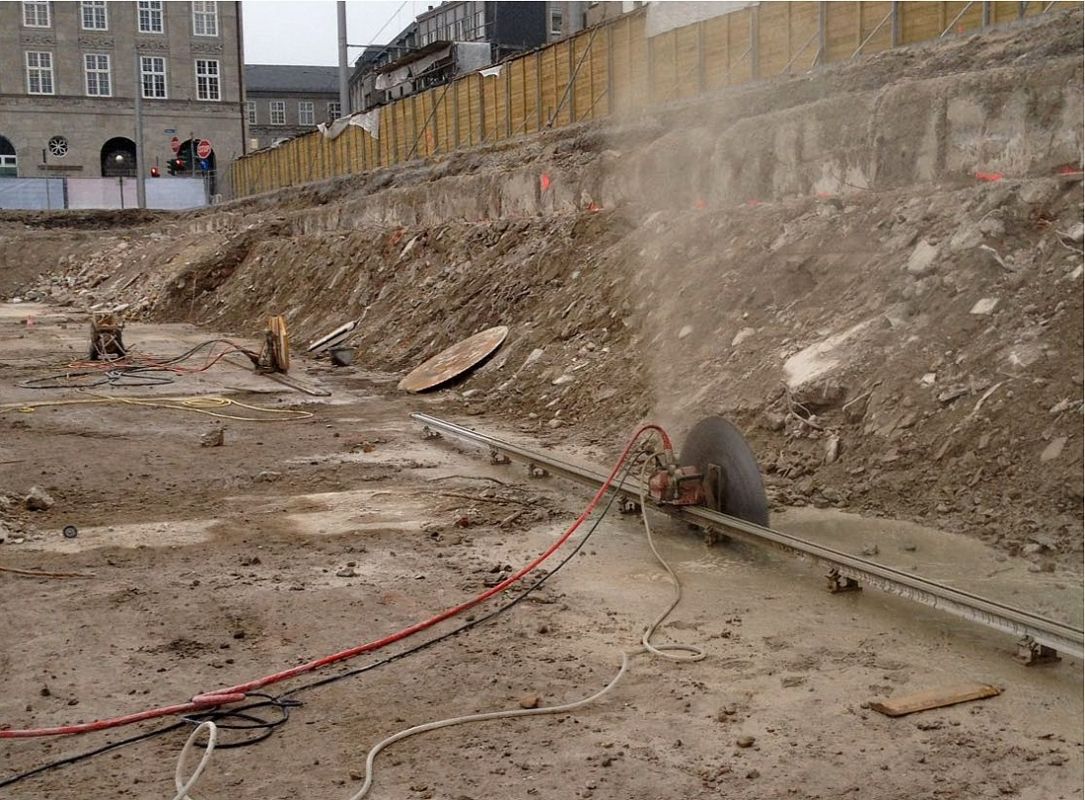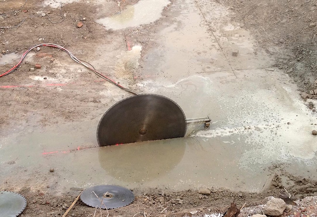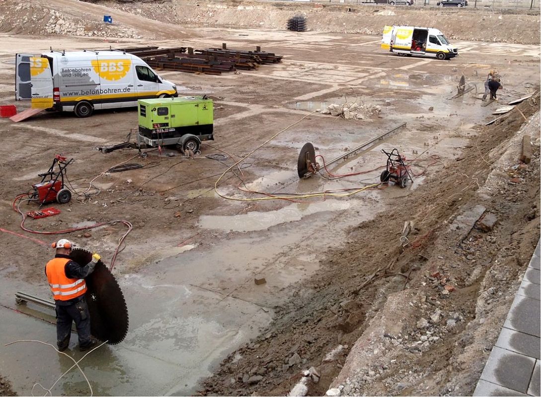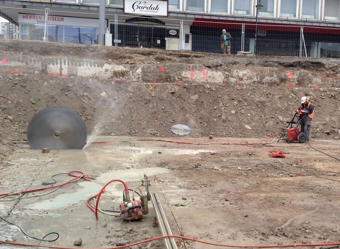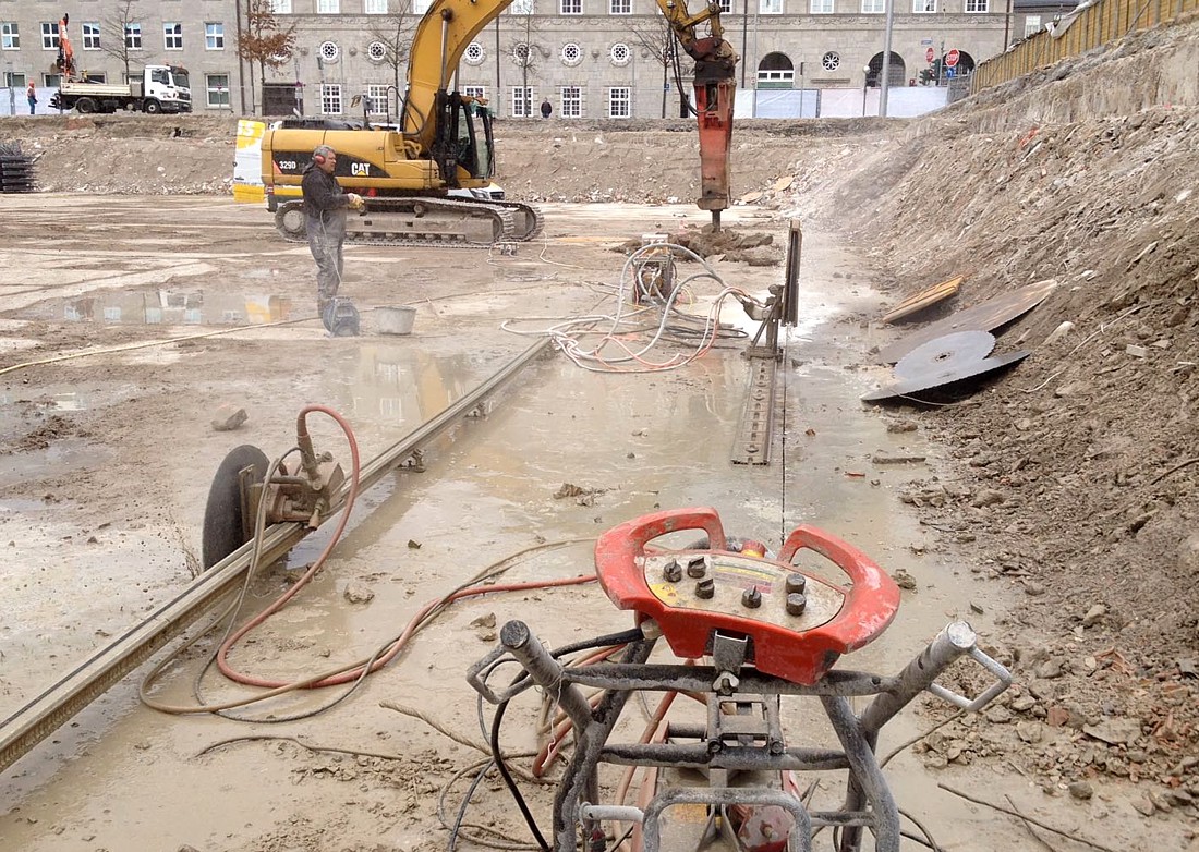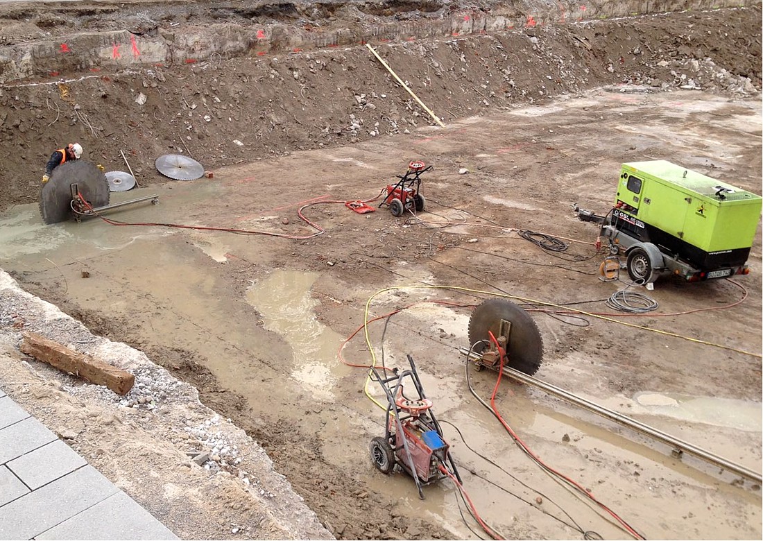 Hier musste eein Bodenplatte wegen Neubaumaßnahmen zurückgebaut werden. Dazu haben wir fast 300 m Trennschnitte, 70 cm tief, ausgeführt. Danach erlgte Ausbau und Abtransport des Betons.Danach erlgte Ausbau und Abtransport des Betons.